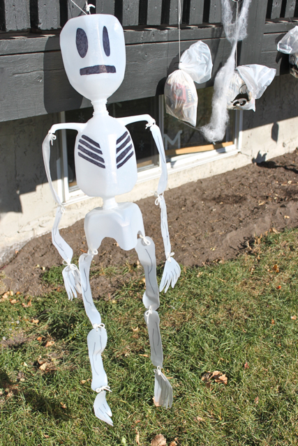 Cut 2 handles off the milk jugs and hot glue them onto one of your milk jugs right side up. These will act as your skeleton's shoulders.